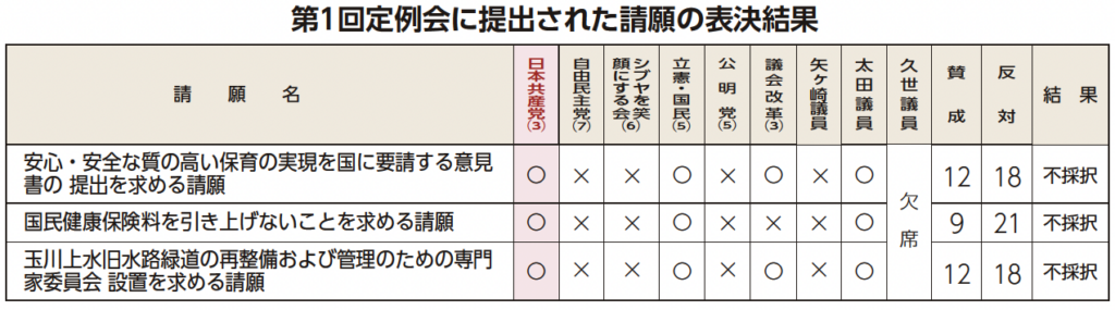 第1回定例会には、保育の質の向上や国保料の値上げ中止、緑道整備についての請願が提出され、党区議団は紹介議員としての説明や本会議での討論など、採択に全力をあげました。