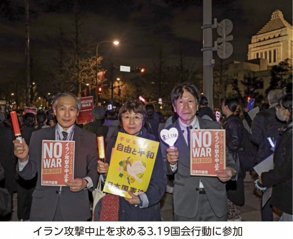 日本共産党区議団は、米国・イスラエルによる国連憲章・国際法違反の先制攻撃を批判し、即時停戦と平和解決を求める決議(案)を提案。大幅修正のうえ全会派一致で可決しました。